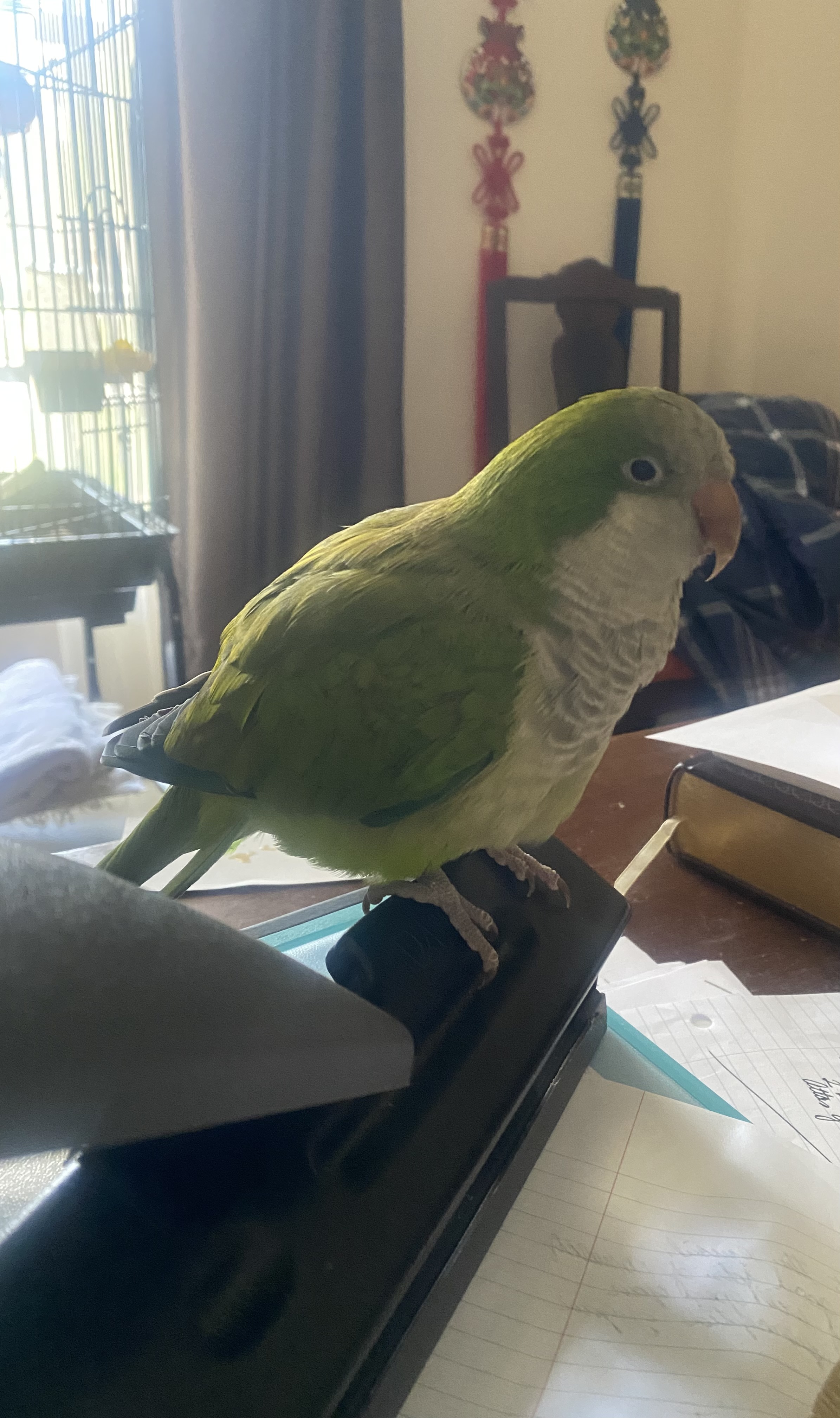This is Max, short for Maxima Desima Meridia. She’s been a happy part of my life and family since 2001, and she is my main co-worker (and supervisor) during my office hours. She’s perched on my 3-hole punch in this picture.